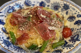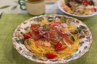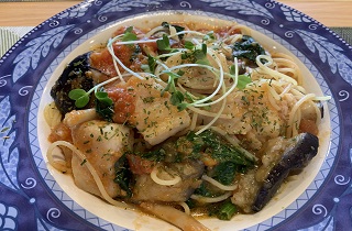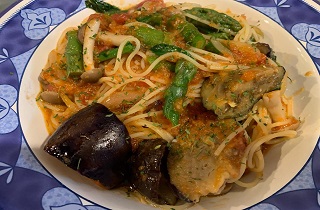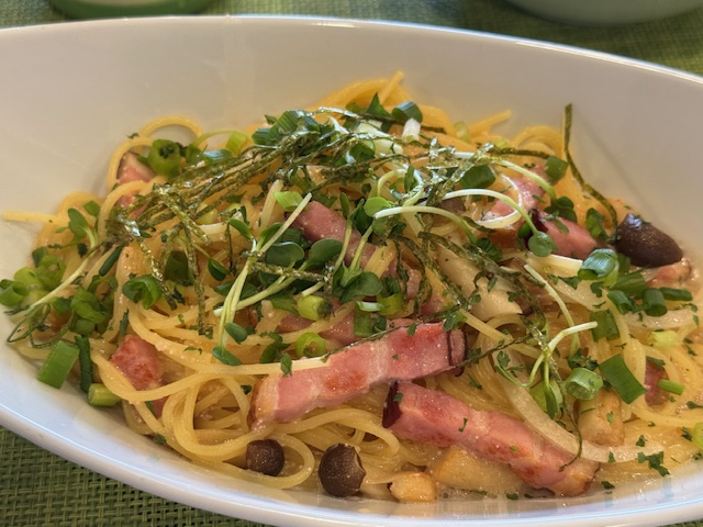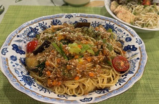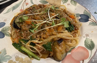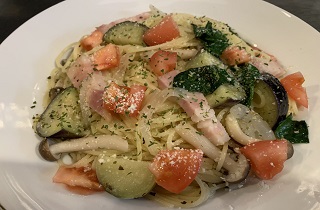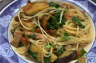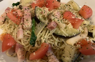 2.茄子とベーコンのバジリコのオリーブパスタ