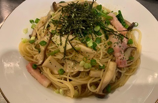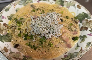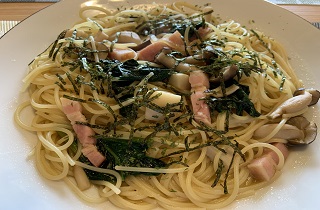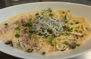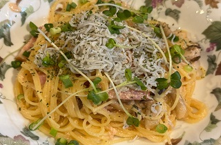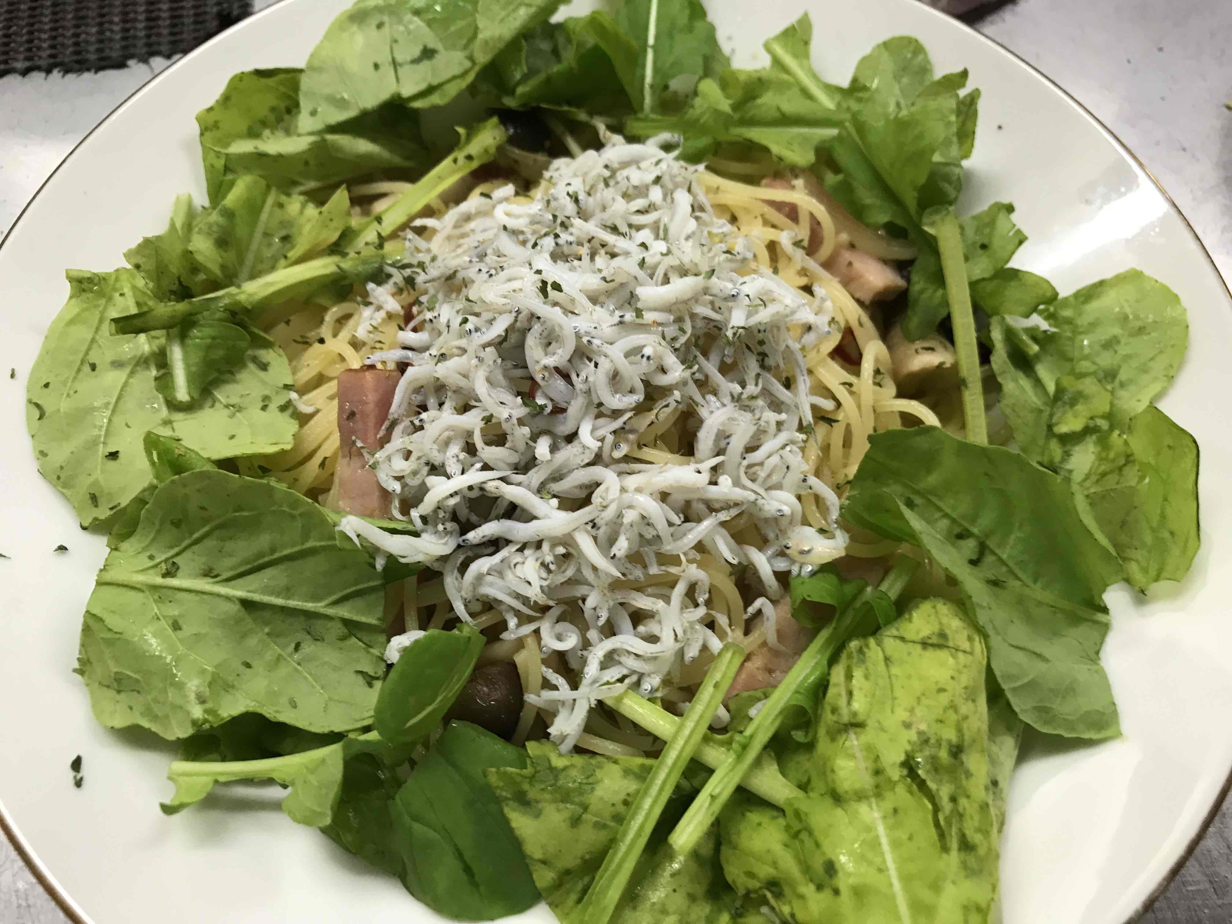 3.釜揚げしらすとベーコンのオリーブパスタ