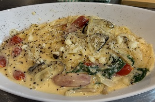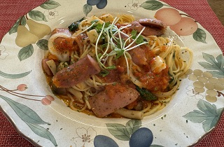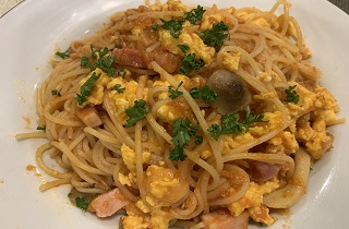 1.赤ウィンナーと揚げなすのカルボナーラ