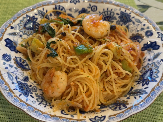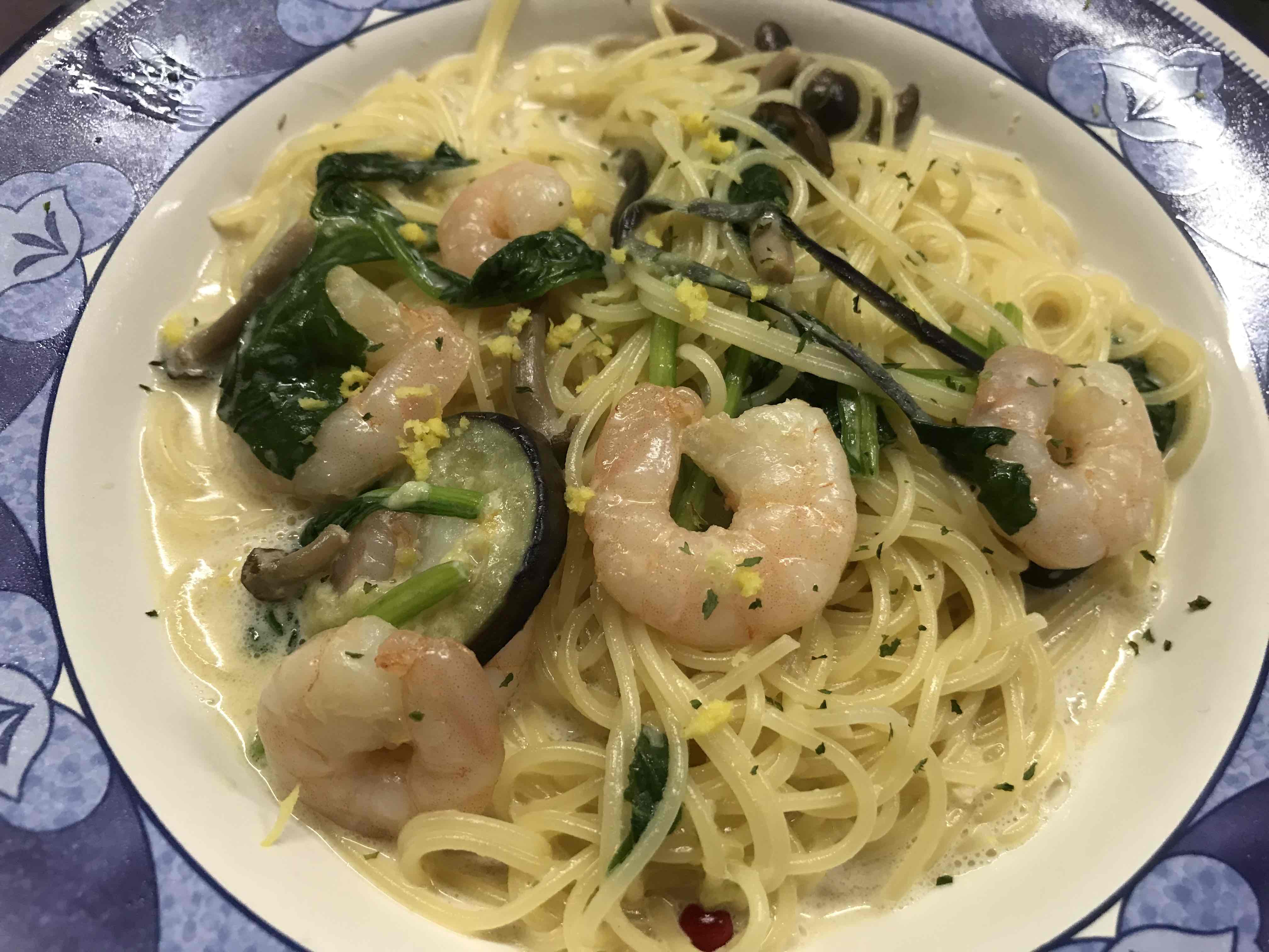1.むき海老と揚げ茄子のカレークリームパスタ