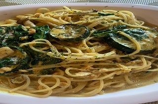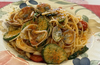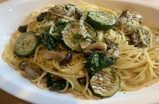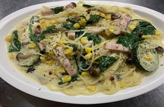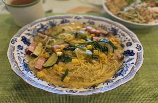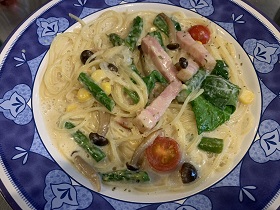 2.ベーコンとズッキーニのコーンクリームパスタ