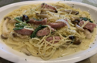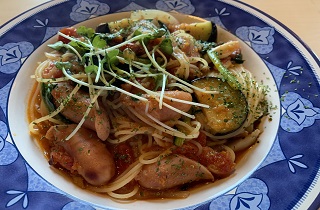 3.ソーセージと茄子キャベツのオリーブパスタ